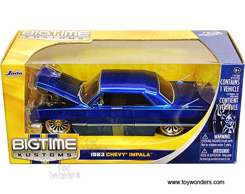 90375 Jada Toys Bigtime Kustoms - 1963 Chevy Impala Hard Top. 1:24 scale diecast collectible model car. This 1963 Chevorlet Impala is an 8.75"L x 3.25"W x 2.25"H with openable hood, doors and trunk, with Symbolic SL-16 rims. This 1963 Chevrolet Impala is a diecast metal and street lowrider. Manufactured by Jada Toys. 6 pcs per inner box and in assorted colors. Each car is individually packed in a window box WB, and box size is 10"L x 4.75"W x 4.75"H. GM is a trademark of the General Motors Corporation.