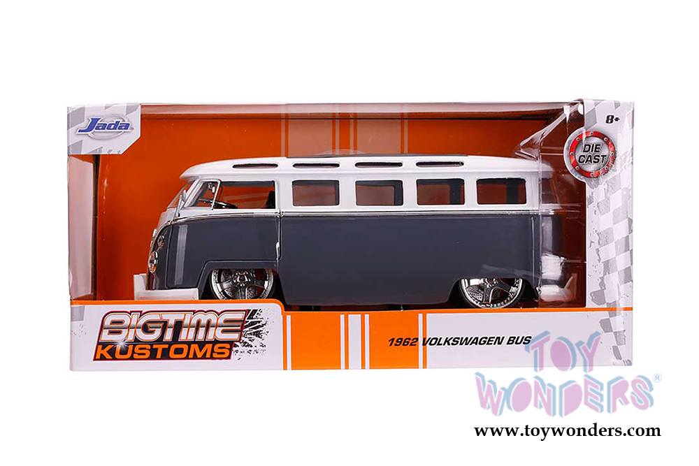 99024 Jada Toys Bigtime Kustoms - 1962 Volkswagen Bus. 1:24 scale diecast collectible model car. This Volkswagen Bus is a 7.25"L x 3"W x 2.75"H die cast metal car with openable doors. Individually packed in a window box WB. Box size: 10"L x 4.75"W x 4.75"H. This 1962 VW Bus is manufactured by Jada Toys. 99024 is in GRAY color with WHITE top.