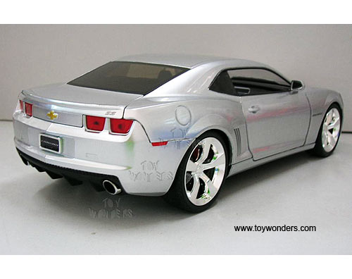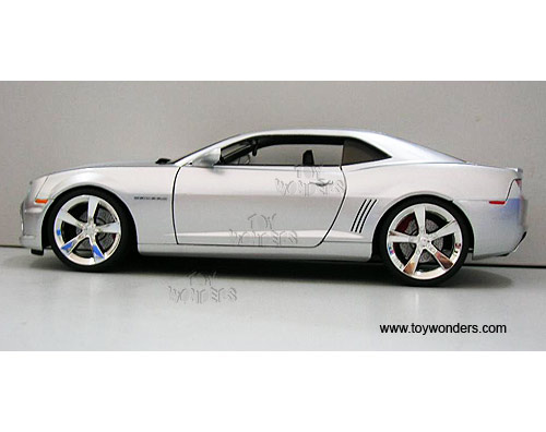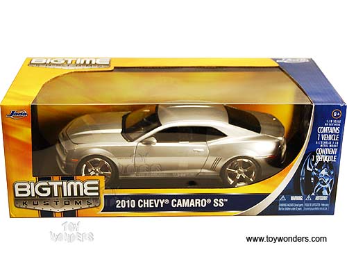 92297 Jada Bigtime Muscle - 2010 Chevrolet Camaro SS Hard Top. 1:18 scale diecast collectible model car. This Chevy Camaro SS is a 10.25"L x 4"W x 2.5"H die cast metal car with openable hood, doors & trunk. Sits on a display plaque. This Chevy Camaro SS is manufactured by Jada Toys. Big Time Muscle. Item 92297 is in SILVER color. Individually packed in a window box. Box size: 14.25"L x 6.75"W x 5.25"H. 3 pcs per inner box. GM is a trademark of the General Motors Corporation.