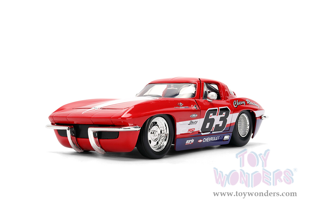 36594 Jada Toys Bigtime Muscle - 1963 Chevrolet® Corvette® Stingray #63 - Chevy Racing. 1:24 scale diecast collectible model car. This Chevrolet® Corvette® is a 7.75"L x 3.25"W x 2.25"H diecast metal car with openable doors and hood. This 63' Chevy® Corvette® is manufactured by Jada Toys. 36594 is in red with white strips. Individually packed in a Window Box WB. Box size: 10"L x 4.75"W x 4.75"H.