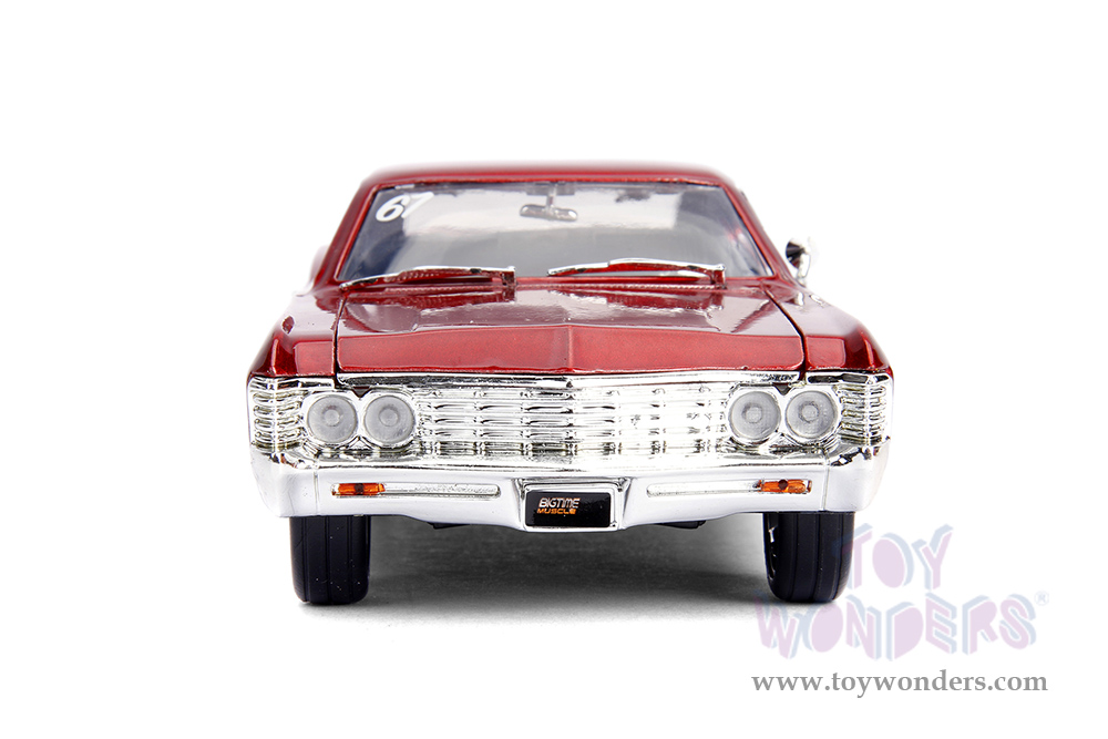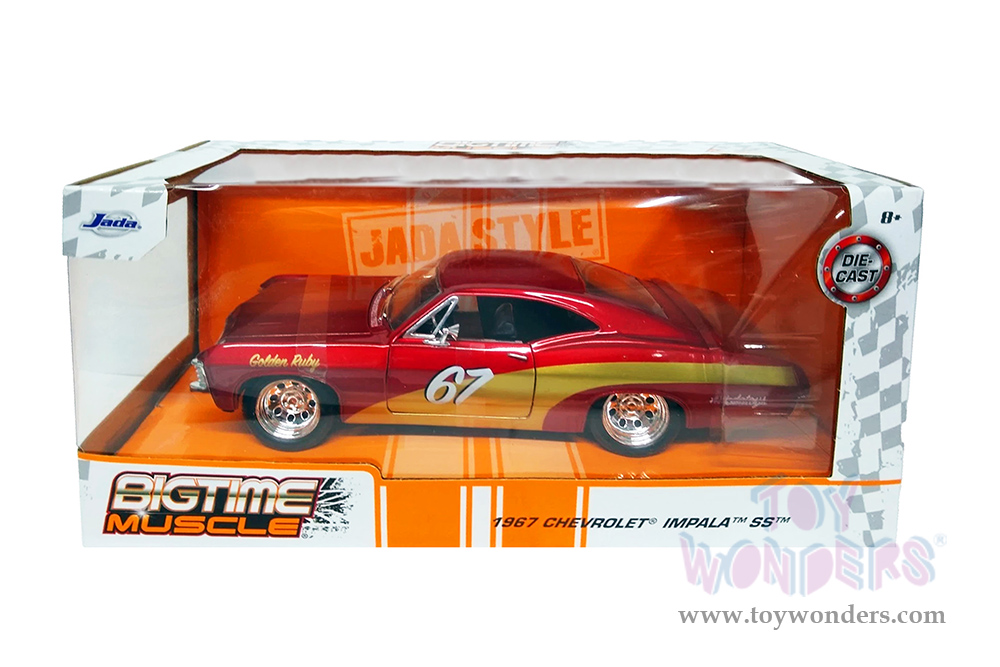 30529 Jada Toys Bigtime Muscle - 1967 Chevrolet® Impala™ SS™ #67 "Golden Ruby". 1:24 scale diecast collectible model car. This 1967 Chevrolet® Impala® is a 8"L x 3"W x 2"H with openable hood and doors. This 67' Chevy® Impala™ is manufactured by Jada Toys. Individually packed in a window box WB. Box size: 10"L x 4.75"W x 4.75"H. 30529 is in red with gold. GM is a trademark of the General Motors Corporation.