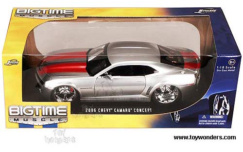 91080SV BIGTIME Muscle - 2006 Chevy Camaro Concept Hard Top. 1:18 scale diecast collectible model car. This Chevrolet Camaro is 11"L x 4.75"W x 2.25"H die cast metal car with openable hood, doors & trunk. This Chevy Camaro is manufactured by Jada Toys. Big Time Muscle. 91080 in SILVER color with Red stripes on hood & trunk. Individually packed in a window box. Box size: 14.25"Lx6.75"Wx 5.25"H. 3 pcs per inner box. GM is a trademark of the General Motors Corporation.