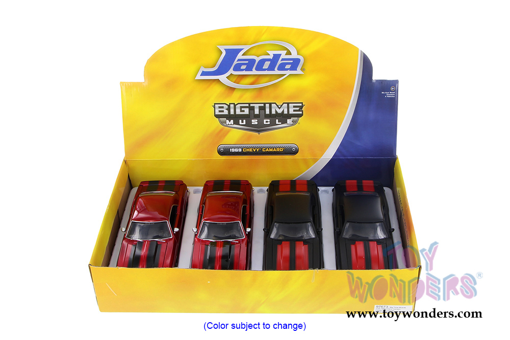 97673PD Jada Toys Bigtime Muscle - 1969 Chevy Camaro Hard Top. 1:24 scale diecast diecast model car. This Chevrolet Camaro is an 8.25"L x 3"W x 2.25"H die cast metal car with openable doors, hood & trunk. Rims: Prostar. Free wheeling. Big Time Muscle. The Chevy Camaro is manufactured by Jada Toys. 4 pcs per display box in assorted colors with stripes. GM is a trademark of the General Motors Corporation.