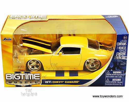 90533 Jada Toys Bigtime Muscle - 1971 Chevy Camaro Hard Top. 1:24 scale diecast collectible model car. This Chevrolet is an 8.25" long die cast model car with openable doors, hood & trunk. Individually packed in a window box WB. The Chevy is manufactured by Jada Toys. 6 pcs/inner box. Assorted colors. GM is a trademark of the General Motors Corporation.