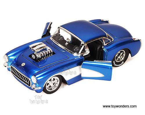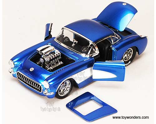 91614PD Jada Toys Bigtime Muscle - 1957 Chevy Corvette Hard Top with Engine Blower. 1:24 Scale diecast collectible model car. This Chevrolet Corvette is an 8"Lx 3.25"Wx 2.25"H die cast metal car with openable doors & trunk, removable hood. Rims: Prostar. This 1957 Chevy Corvette is manufactured by Jada Toys. 4 pcs per display box in assorted colors and 16 pcs per inner box. GM is a trademark of the General Motors Corporation.
