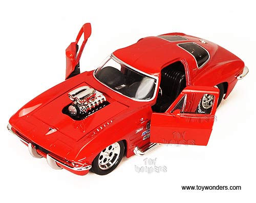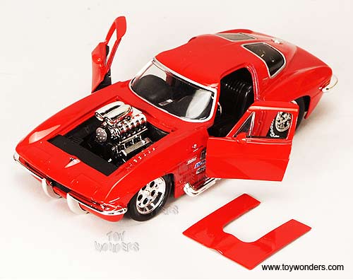 91615 Jada Toys Bigtime Muscle - 1963 Chevy Corvette Stingray Hard Top with Engine Blower. 1:24 Scale diecast collectible model car. This Chevrolet Corvette Sting Ray is a 7.75"Lx 3.25"Wx 2.25"H die cast metal car with openable doors & trunk, and removable hood. Magnum Drag Rims. This 1963 Chevy Corvette Stingray is manufactured by Jada Toys. Individually packed in a window box WB. Box size: 10"Lx 4.75"Wx 4.75"H. 6 pcs per inner box. Item 91615 is in assorted colors. GM is a trademark of the General Motors Corporation.   To see more Big Time Muscle automotive themed cars (click here). To see more Chevy Corvette collector die-cast models (click here). To see more Jada collector die-cast models (click here).  Case pack: 12 pcs. Sold in lots of 6 pcs. Price quoted is for 1 pcs.