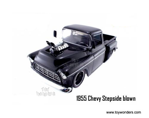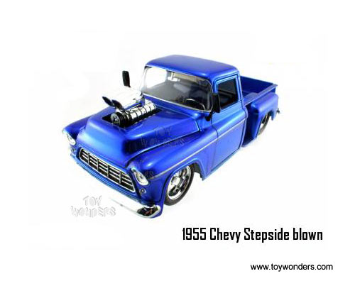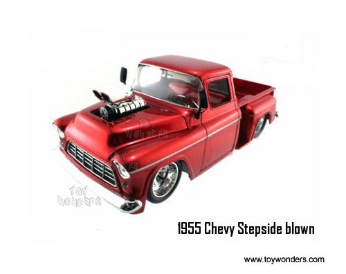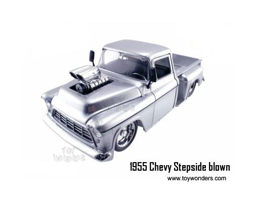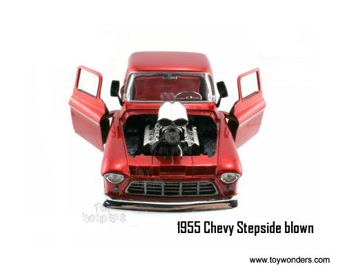 92043KE Jada Toys Bigtime Muscle - 1955 Chevy Stepside with Engine Blower. 1:24 scale diecast collectible model car. This Chevrolet Stepside is an 8"Lx 3.25"Wx 2.25"H die cast metal car with openable doors, hood and trunk. Details & Chromed-out engine. Rims: GM Rally. Pickup, Pick-Up, Pick Up. The Chevy Stepside is manufactured by Jada Toys. Big Time Muscle. 4 pcs per display box in assorted colors. 16 pcs per inner box. GM is a trademark of the General Motors Corporation.