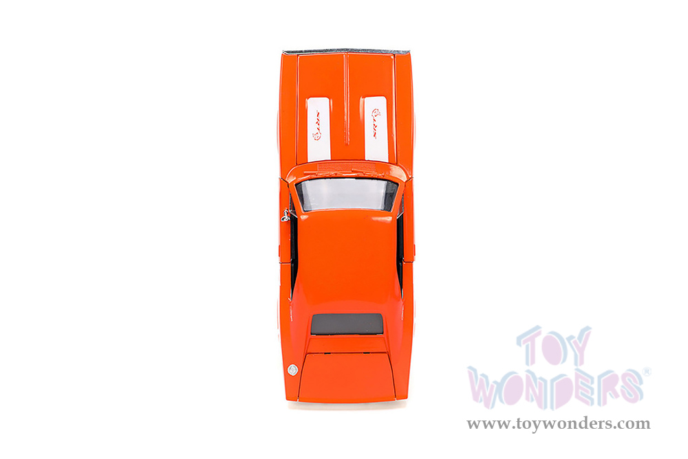 34197 Jada Toys Bigtime Muscle - 1968 Dodge Charger R/T SRT. 1:24 scale diecast collectible model car. This Dodge Charger is an 8.5"L x 3.25"W x 2.25"H diecast metal car with openable hood, doors and trunk. This Dodge is manufactured by Jada Toys. 34197 is in orange with white stripes. Individually packed in a Window Box WB. Box size: 10"Lx 4.75"Wx 4.75"H.
