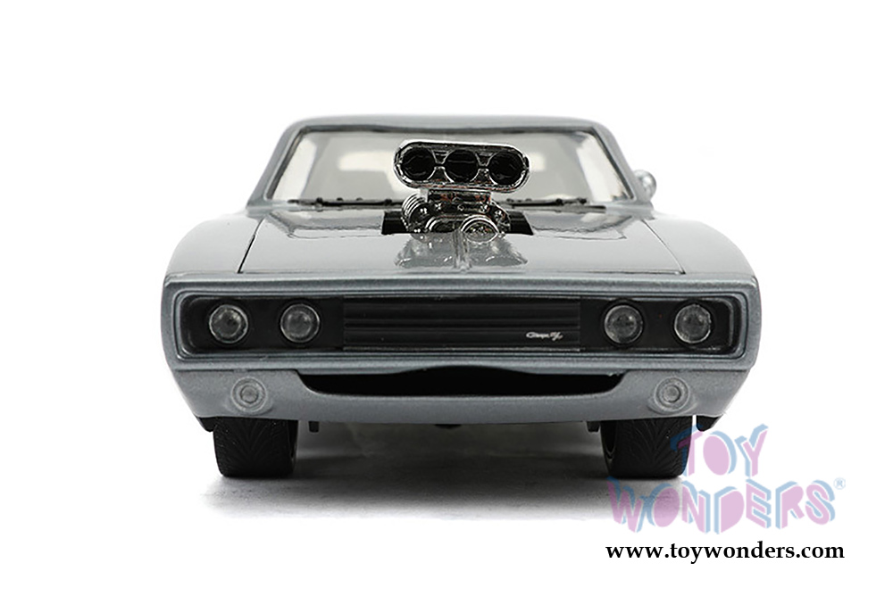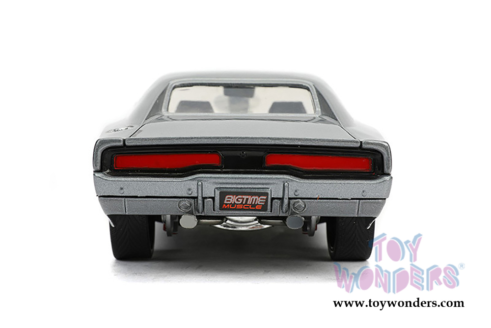 31668 Jada Toys Bigtime Muscle | 1970 Dodge Charger R/T with Blower Hardtop. 1:24 scale diecast model car. This Dodge is an 8.5"L x 3.25"W x 2.25"H diecast metal car with openable doors and trunk. Removable Hood. Freewheeling. Big Time Muscle. The Dodge Charger is manufactured by Jada Toys. 31668 is in Glossy Gray. Individually packed in a Window Box WB. Box size: 10"Lx 4.75"Wx 4.75"H.