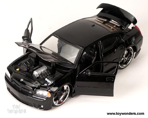 90798Z BIGTIME Muscle 2006 Dodge Charger SRT8. 1:24 scale diecast model car. 8.5"L x 3.5"W x 2.75"H die cast metal with opening doors/hood/trunk. Details & chromed-out engine. GFG GF16 Rims. Big Time Muscle. Display box of 4 pcs in assorted colors. Jada Toys.