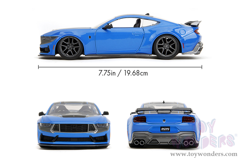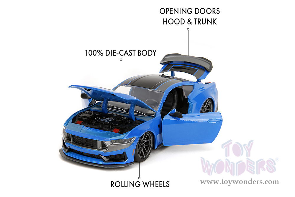 35276 Jada Toys Bigtime Muscle - 2024 Ford Mustang Dark Horse. 1:24 scale diecast collectible model car. This Ford Mustang is an 8"L x 3.75"W x 2.5"H diecast with openable hood, doors and trunk. This Mustang Shelby® is manufactured by Jada Toys. 35276 is in blue with black and gary stripes. Individually packed in a Window Box WB. Box size: 10"Lx 4.75"Wx 4.75"H.