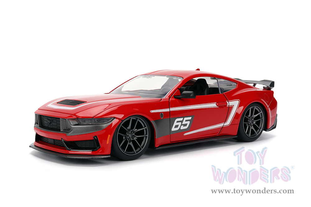 36346 Jada Toys Bigtime Muscle - 2024 Ford Mustang Dark Horse #65. 1:24 scale diecast collectible model car. This Ford Mustang is an 8"L x 3.75"W x 2.5"H diecast with openable hood, doors and trunk. This Mustang is manufactured by Jada Toys. 36346 is in glossy red. Individually packed in a Window Box WB. Box size: 10"Lx 4.75"Wx 4.75"H.