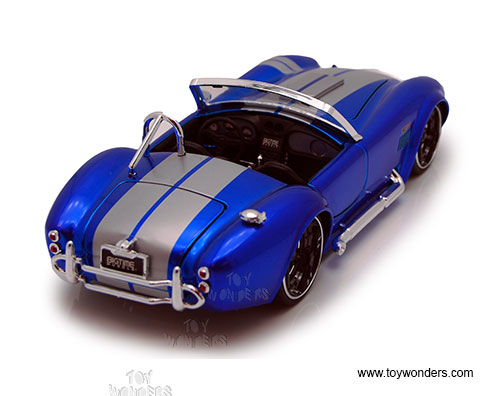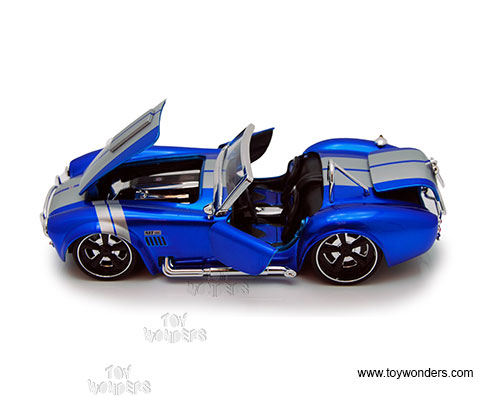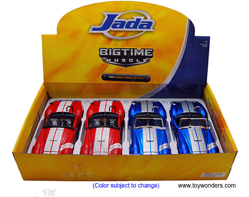90540WS Jada Toys Bigtime Muscle - 1965 Shelby Cobra 427 S/C Convertible. 1:24 scale die cast collectible model car. This Shelby Cobra is an 8"Lx 3.5"Wx 2.25"H die cast car with open able doors, hood & trunk. Details & chromed-out engine. Rims: V-Spek. This 65 Shelby Cobra is manufactured by Jada Toys. 4 pcs per display box. 90540 is in assorted colors.