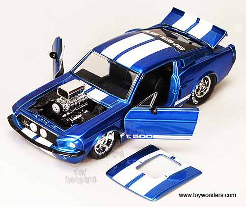 92017PD Bigtime Muscle - 1967 Shelby GT-500 Hard Top with Eingine Blower. 1:24 scale diecast model car. This Shelby GT500 is an 8.25" long x 3.25"Wx 2.25"H die cast metal with openable doors, hood and trunk. Details & Chromed-out engine. Rims: Prostar. This Shelby GT-500 is manufactured by Jada Toys. 4 pcs per display box in assorted colors. 16 pcs per inner box.  To see more Big Time Muscle automotive themed cars (click here). To see more Jada collector die-cast models (click here).  Case pack: 32 pcs. Sold in lots of 4 pcs. Price quoted is for 1 pcs.