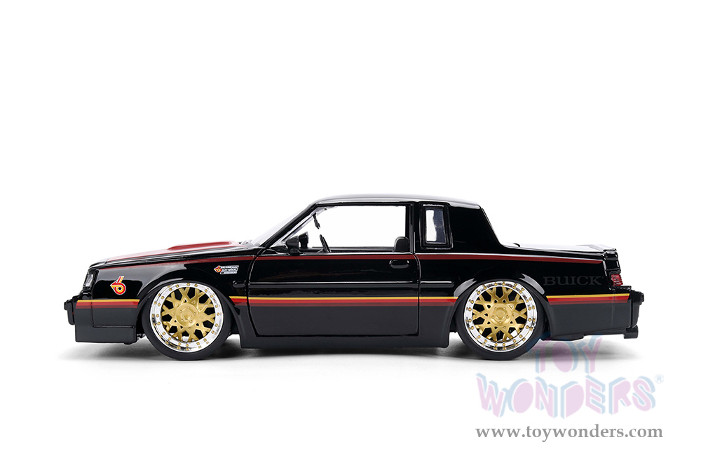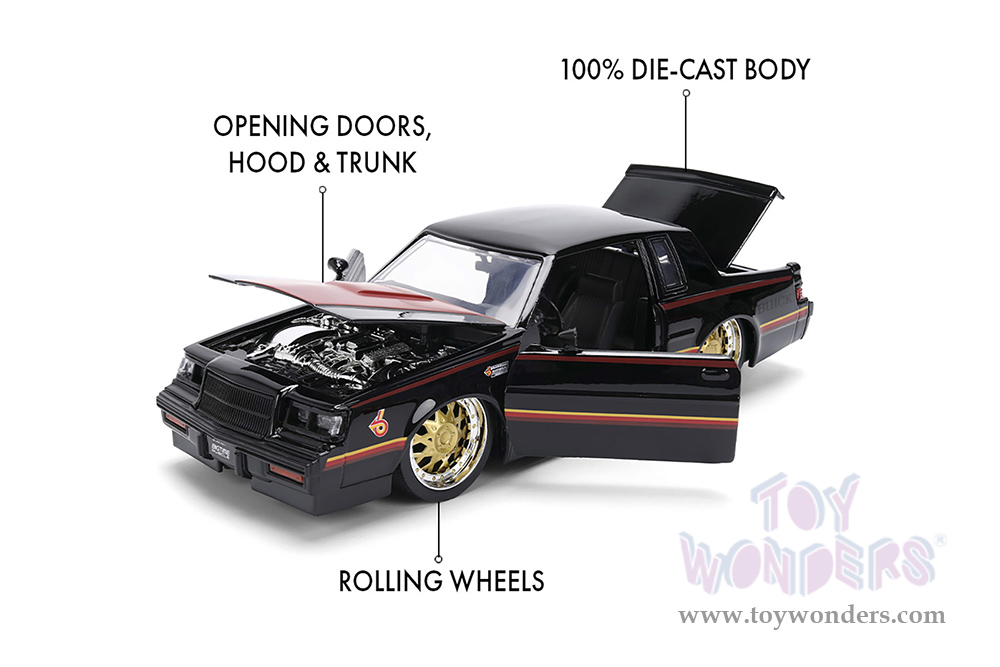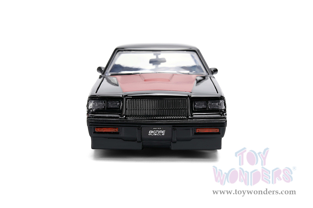 36586 Jada Toys Bigtime Muscles - 1987 Buick® Grand National™ Hard Top. 1:24 scale diecast collectible model car. This Buick® is an 8"L x 3"W x 2.5"H diecast metal car. Freewheeling with openable doors, trunk, and hood. This '87 Buick Grand National is manufactured by Jada Toys. Individually packed in a window box. Window Box size: 10"L x 4.75"W x 4.75"H. 36586 is in black with red hood.