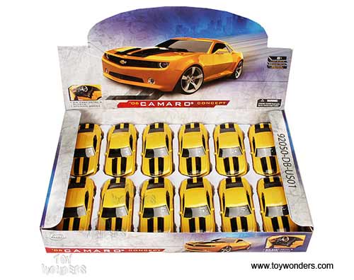 92050PW Jada Toys - 2006 Bumblebee Chevrolet Camaro Concept Hard Top. 1:32 scale diecast collectible model car. This Chevy Camaro is a 5.5"Lx 2.25"Wx 1.5"H die cast metal car with openable hood. This Chevy Camaro Bumble bee is manufactured by Jada Toys. GM is a trademark of the General Motors Corporation. 92050 is in YELLOW color with Black stripes on hood & trunk. 12 pcs per display box, and 36 pcs per inner.