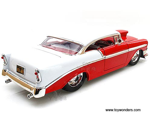 96650 Jada Toys Collector's Club - 1956 Chevy Belair Hard Top. 1:18 Scale diecast collectible model car. This Chevrolet Bel Air is an 11"L x 4"W x 2.75"H die cast metal car with openable hood, doors & trunk. Sits on a display plaque. This 1956 Chevy Belair is manufactured by Jada Toys. Individually packed in a window box. Box size: 14.25"L x 6.75"W x 5.25"H. Item 96650 is in RED & WHITE 2-tone colors. GM is a trademark of the General Motors Corporation. Limited edition. 3 pcs per inner.