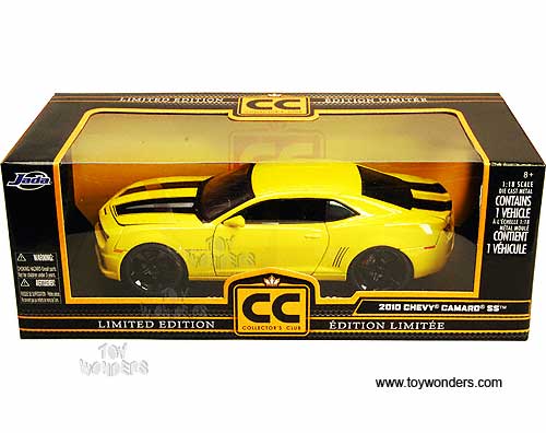 96325 Jada Toys Collector's Club - 2010 Chevy Camaro SS Bumblebee Hard Top. 1:18 Scale diecast collectible model car. This Chevrolet Camaro SS Bumble bee is a 10.5"L x 4"W x 2.75"H die cast metal car with openable hood, doors & trunk. Sits on a display plaque. This 2010 Chevy Camaro SS is manufactured by Jada Toys. Individually packed in a window box. Box size: 14.25"L x 6.75"W x 5.25"H. Item 96325 is in YELLOW with stripes. GM is a trademark of the General Motors Corporation. Limited edition. 3 pcs per inner.