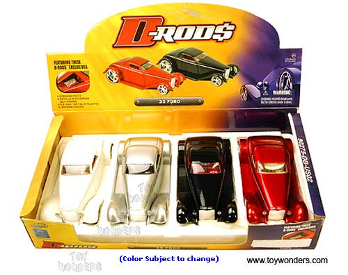 90275A D-RODZ 1932 Ford Hard Top W/Fender. 1:24 scale diecast model car. This Ford is an 8" die cast car with openable doors, hood & trunk. D RODS Rims: KMC SS. The Ford is manufactured by Jada Toys. Also known as D-Rod D Rod D Rods D Rodz DRod DRodz DRods D-ROD$. 4 pcs per display box. 90275 in assorted colors.