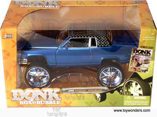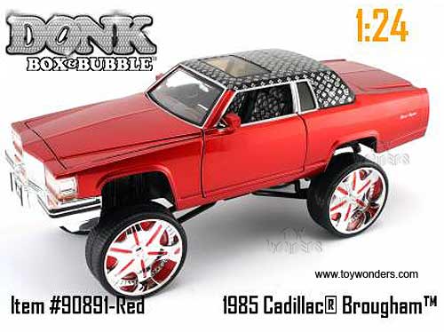 90891 DONK Box & Bubble - 1985 Cadillac Brougham. 1:24 scale diecast model car. This Cadillac Brougham is a 9.5" long diecast with openable doors, hood & trunk. Details and chromed-out engine. Manufactured by Jada Toys. Individually packed in a window box WB. Assorted colors. GM is a trademark of the General Motors Corporation.