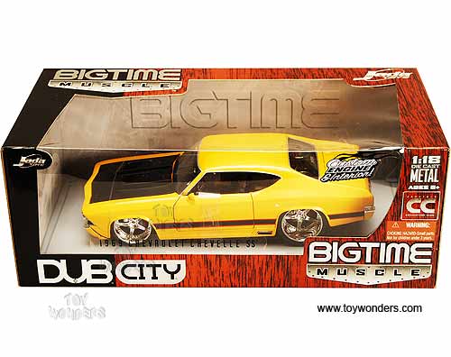 90053YL Dub City Bigtime Muscle - 1969 Chevy Chevelle SS Hard Top. 1:18 Scale diecast collectible model car. This Chevrolet is a 10.75" long die cast metal car with openable doors, hood and trunk. Detailed custom engine and interior. GFG "GF16" Rims. Big Time Muscle. The Chevy Chevelle is manufactured by Jada Toys. Dubcity. 90053 in YELLOW color with Stripes. Individually packed in a window box. GM is a trademark of the General Motors Corporation.
