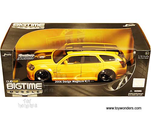 90562YL Jada Toys Dub City Bigtime Muscle - 2006 Dodge Magnum R/T SUV. 1:18 scale diecast collectible model car. This Dodge is a 10.5" long die cast model. Custom engine & interior. Limited Edition 1 of 3,750 pcs. DubCity Big Time Muscle. The Dodge is manufactured by Jada Toys. 90562 in YELLOW color with Black stripes. Individually packed in a window box.