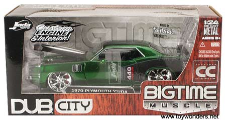 90059 Dub City Big Time Muscle - 1970 Plymouth Cuda Hard Top. 1:24 scale diecast collectible model car. This 1970 Plymouth Cuda is a 7.75" lone die cast with openable doors, hood & trunk. Custom engine & interior. Dubcity Bigtime Muscle. This 1970 Plymouth Barracuda is manufactured by Jada Toys. 90059 in assorted colors. Individually packed in a window box WB.