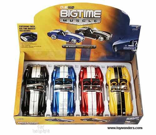 90540PD Jada Toys Dub City Big Time Muscle - 1965 Shelby Cobra 427 S/C Convertible. 1:24 scale die cast collectible model car. 8"Lx 3.5"Wx 2.25"H die cast car with opening doors, hood & trunk. Details & chromed-out engine. Rims: Prostar. This Shelby is manufactured by Jada Toys. DubCity. 4 pcs per display box. 90540 in assorted colors.