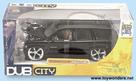 53639 DUB City - 2002 Cadillac Escalade Scale: 1:24 Dimensions: 8"L x 3.25"W x 2.75"H 2002 Cadillac Escalade die cast metal collectible with opening doors, hood & rear, free wheel, KMC 5 spoke rims. Street low rider. Manufactured by Jada Toys Individually window boxed Box: 9.75"L x 4.5"W x 4.5"H 6 pcs/inner in assorted colors