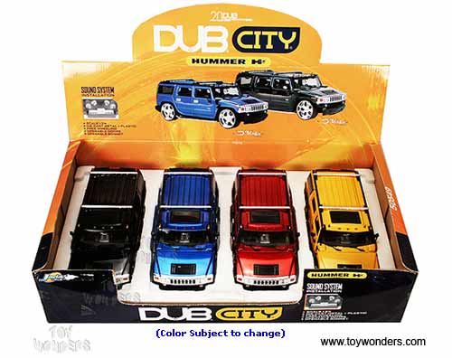 50549GI/24 JADA DUB City - Hummer H2 SUV. 1:24 scale diecast model car. This Hummer H2 is a 8.5" long with opening doors/hood/trunk. This Humvee has Free wheeling. This H2 Hummer also has "Sound System" installation and D'Vinci Pasha rims. This DUB City Hummer H2 is manufactured by Jada Toys. Dubcity. 4 pcs per display box and is assorted colors.