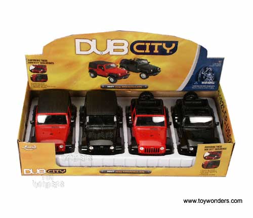 91925TJ Dub City - 2007 Jeep Wrangler Hard Top and Convertible.1:24 scale diecast collectible model car. This Jeep Wrangler is a 7.50"Lx 3.75"Wx 3.50"H die cast metal car with openable doors, and pull back motor action. Diamo rims. This 2007 Jeep Wrangler is manufactured by Jada Toys. 4 pcs per display box and in BLACK and RED colors. 16 pcs per inner box.