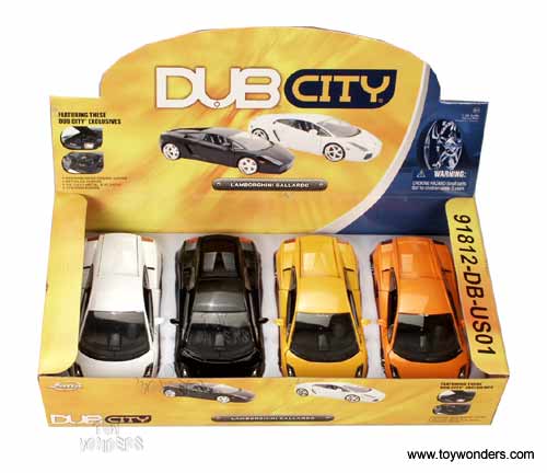 91812JO DUB CITY - Lamborghini Gallardo. 1:24 scale diecast model car. This Lamborghini Gallardo is 8"Lx3.25"Wx1.75"H diecast car with opening doors/hood/trunk. Rims: HRE 542R. Dub City  Jada Toys. Display of 4 pcs. 91812 in assorted colors.