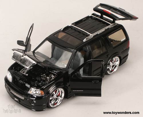 50649FF JADA DUB City - 2003 Lincoln Navigatorv SUV. 1:24 scale diecast model car. This 2003 Lincoln Navigator is an 8.5" long x 4.25"W x 3"H die cast SUV with opening doors/hood/hatchback. This 03 Lincoln Navi has "Sound System" installation. This SUV also has details & chromed-out engine. Manufactured by Jada Toys. 4 pcs per display box and in assorted colors. 12 pcs per inner box.