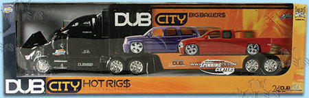 23159 Jada Toys Dub City - Peterbilt 387 Truck. 1:32 scale diecast collectible model car. This Peterbile 387 tractor is a 23" long die cast metal with plastic trailer with openable hood, doors & tailgate. Detail interior and exterior. Featuring wheels with spinning center. Manufactured by Jada Toys. 23159 in BLACK color. Individually packed in a window box.