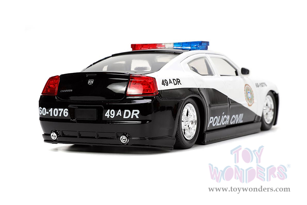 33665 Jada Toys Fast & Furious - 2006 Dodge Charger Police "Policia Civil". 1:24 scale diecast collectible model car. This Dodge Charger is an 8.75"L x 3.75"W x 2.75"H diecast collection car with freewheeling. Openable doors, hood, and trunk. Manufactured by Jada Toys. Diecast Collector's series. Individually packed in a window box. Window Box size: 10"L x 4.75"W x 4.75"H. 33665 is in Black and white.