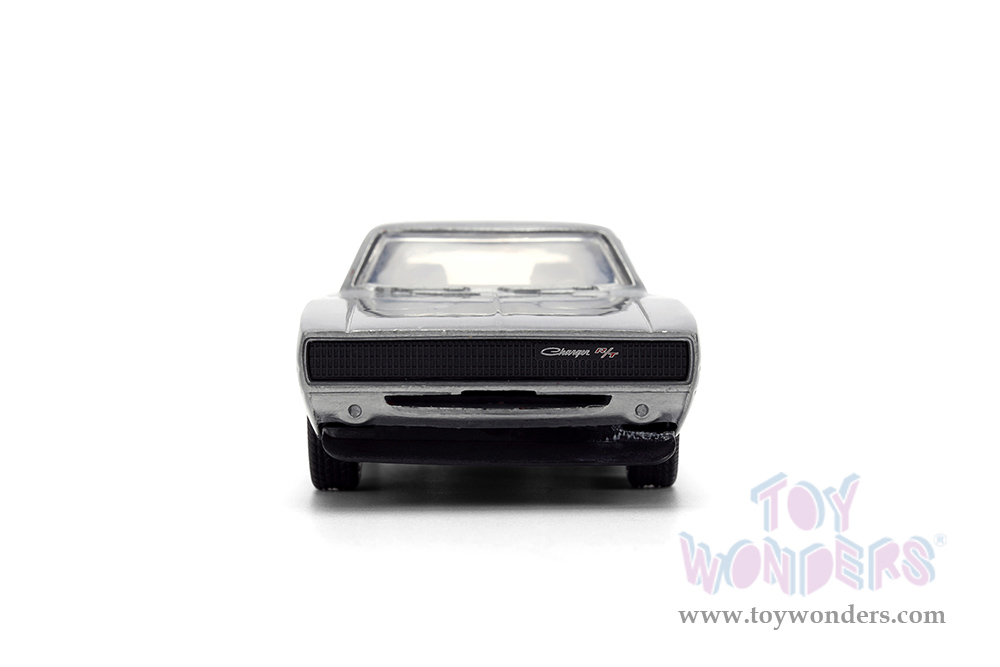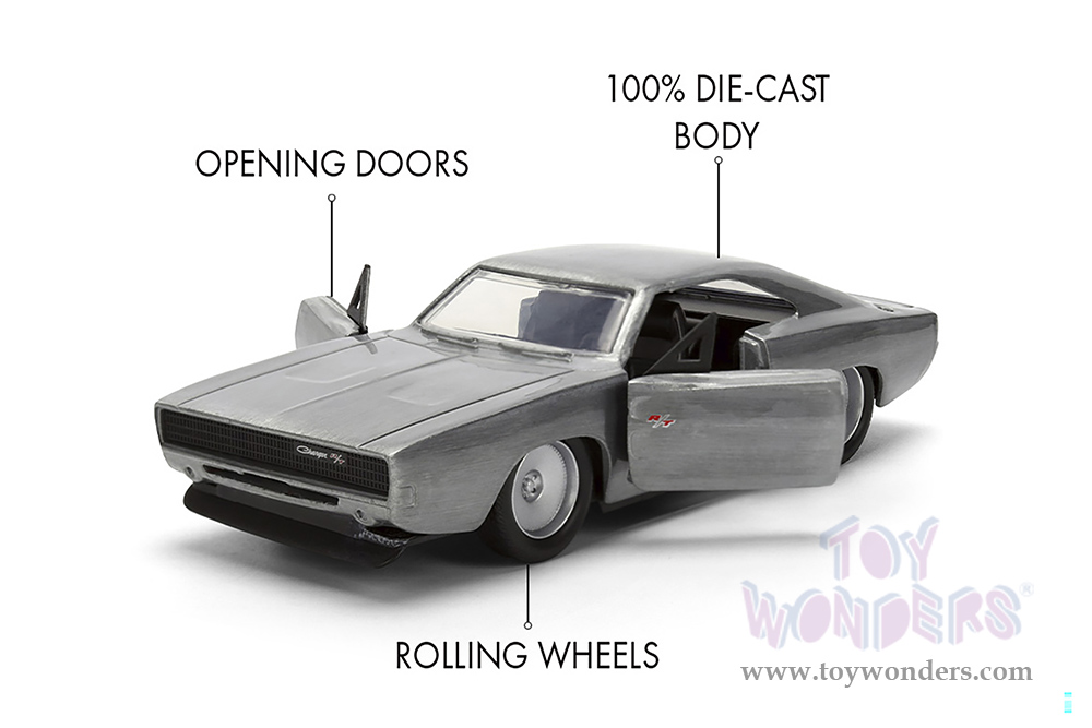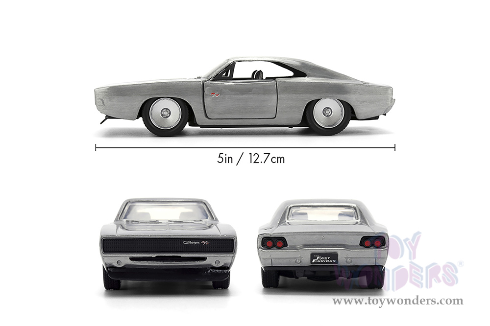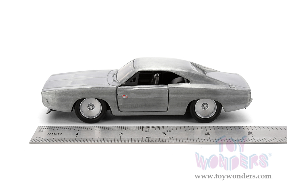 97350 Jada Toys Fast & Furious - Dom's Dodge Charger R/T Hardtop. 1:32 scale diecast collectible model car. This Dodge Charger is 5 1/2"L x 2"W x 1.5"H diecast classic muscle cars from the Fast & Furious movie. Freewheeling. This Dodge Charger is manufactured by Jada Toys. It comes individually packed in a hang tab window box. Window box is 6"L x 3"W x 3"H. Item 97350 is in bare metal finish.12 pcs per inner.