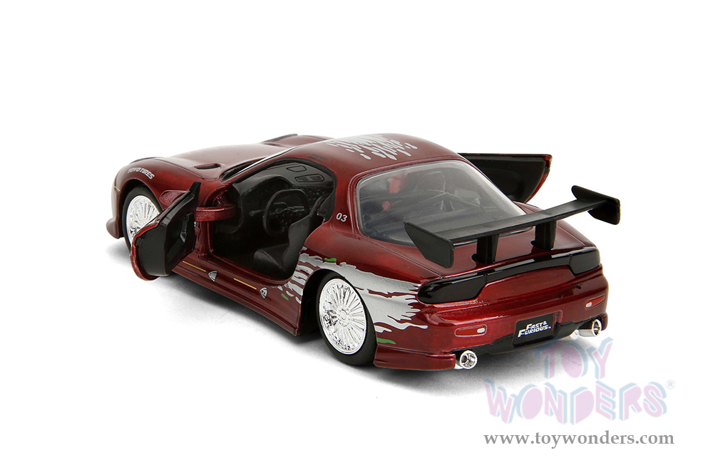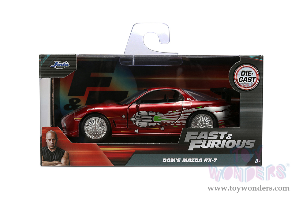 35400 Jada Toys Fast & Furious - 1995 Dom's Mazda RX-7 (2001 Movie). 1:32 scale diecast collectible model car. This Mazda is a 5"L x 1.75"W x 1.5"H diecast classic muscle car from the Fast & Furious (2001 movie). Collector's DIE CAST Series. Openable doors. This Mazda RX-7 is manufactured by Jada Toys. It comes individually packed in a hang tab window box. Window box is 6"L x 3"W x 3"H. Item 35400 is in candy red with graphics.