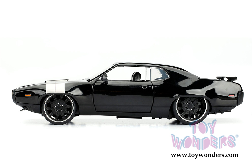 98428 Jada Toys Fast & Furious - Dom's Plymouth GTX Hardtop. 1:24 scale diecast collectible model car. This Plymouth GTX is an 8.5"L x 3.5"W x 2.25"H diecast metal car. Freewheeling with openable hood, doors, and trunk. The Dom's Plymouth GTX is manufactured by Jada Toys. Collector's Diecast Series. Individually packed in a window box. Window Box size: 10"L x 4.75"W x 4.75"H.  4 pcs per display box. Item 98428 is in BLACK with silver stripes on the hood. 16 pcs per inner box.