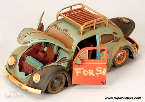 91345MT Jada Toys For Sale - 1959 VW Beetle Hard Top with Rack. 1:24 Scale diecast model car. This Volkswagen Beetle is 7.5" long x 3"W x 3"H die cast metal with opening doors, hood and rear engine. Detailed engine and interior. Rims: VW Stock Babymoon. Painted "For Sale" on the door. This Volkswagen is manufactured by Jada Toys. 4 pcs per display box. 16 pcs per inner box.