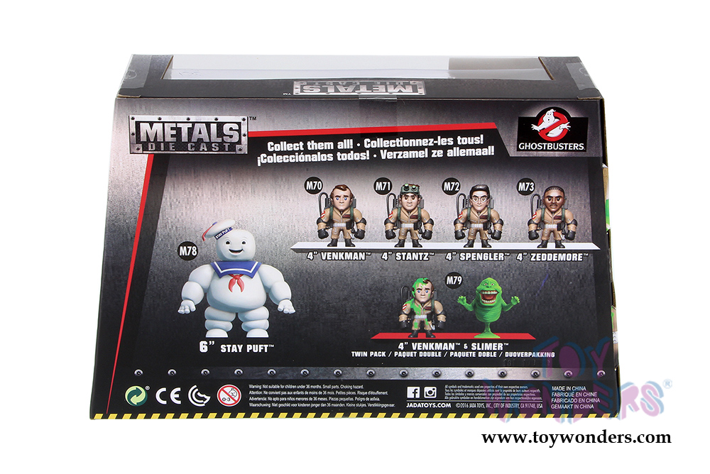 97719 Jada Toys Ghostbusters (1984) - Slimed Peter Venkman and Slimer Twin Pack. Diecast collectible model toy. These figures are 4" high die cast metal toy figures. It features Peter Venkman and Slimer from the legendary film Ghostbusters produced in 1984. This version of Peter Venkman and Slimer is manufactured by Jada Toys. Individually packed in a window box WB. Window box is 10"L x 3"W x 6.25"H. Item 97719 is in his epic KHAKI flight suit and slimer in Green.