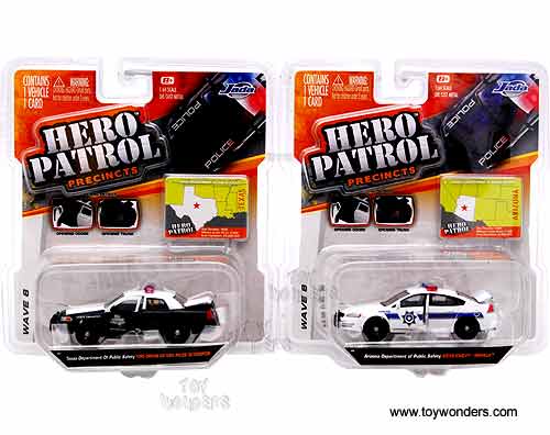 14016W6 Jada Toys Hero Patrol - Diecast Police Cars Wave 6. 1:64 scale diecast collectible model car. This police cars are 3.5" long with openable doors & trunks. Each car individually blister carded. Card size: 6" x 7". 14016W6 is in assorted styles. GM is a trademark of the General Motors Corporation.