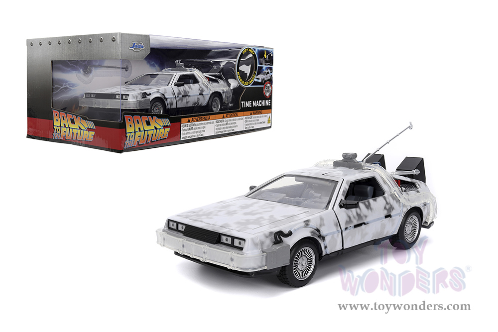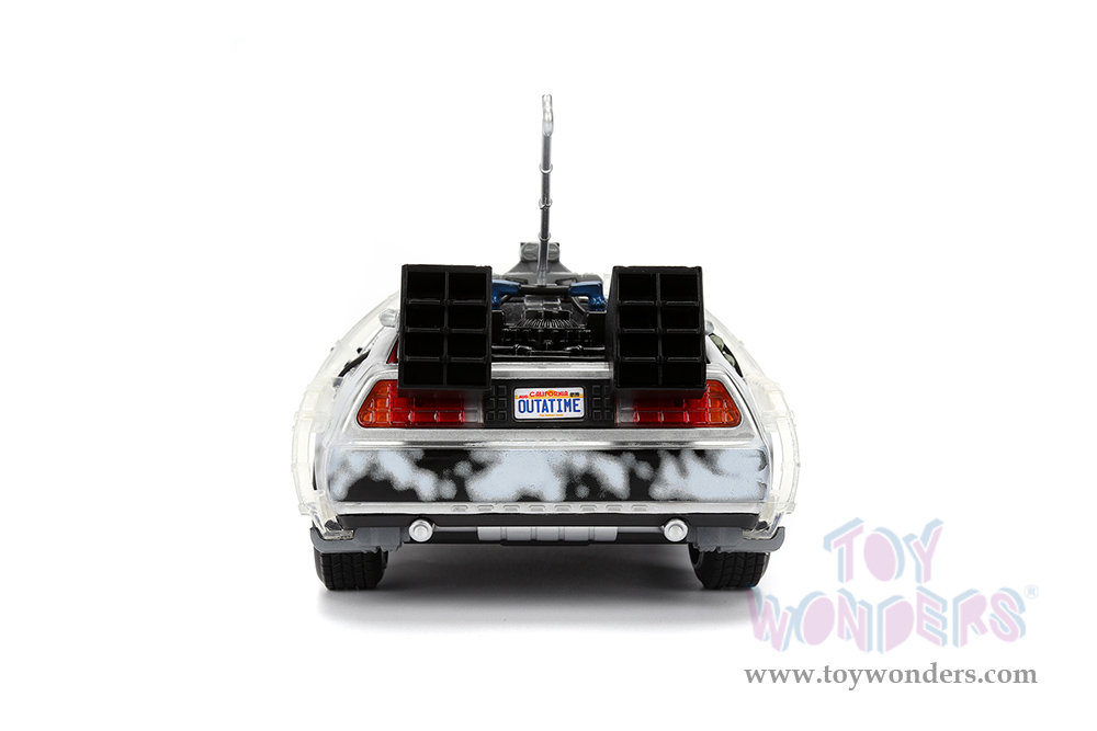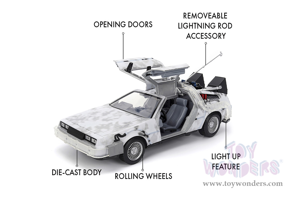 36145 Jada Toys - Hollywood Rides | Back to the Future Part I (1990 Movie) De Lorean Time Machine with lights Frost version. 1:24 scale diecast collectible model car. This De Lorean is an 8.25"Lx 3.75"Wx 2.75"H diecast metal car with openable seagull doors. This car is manufactured by Jada Toys. It comes individually packed in a window box. Window box is 10"L x 6"W x 4.75"H. Item 36145 is in Brushed Metal. Batteries included.