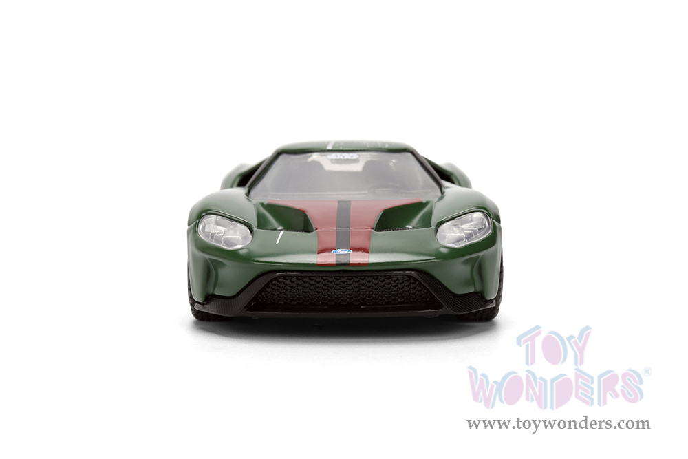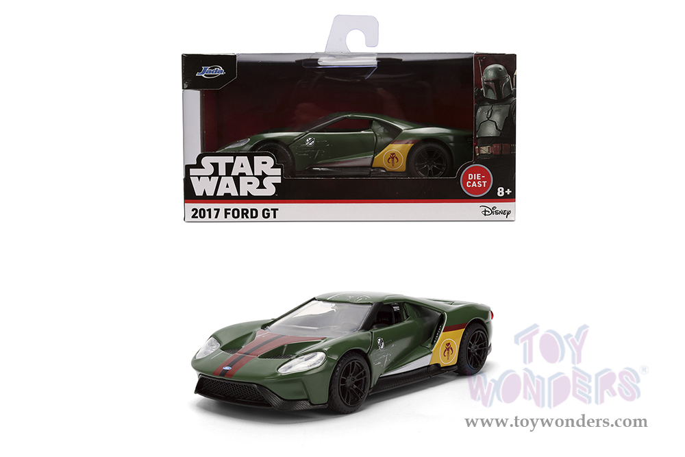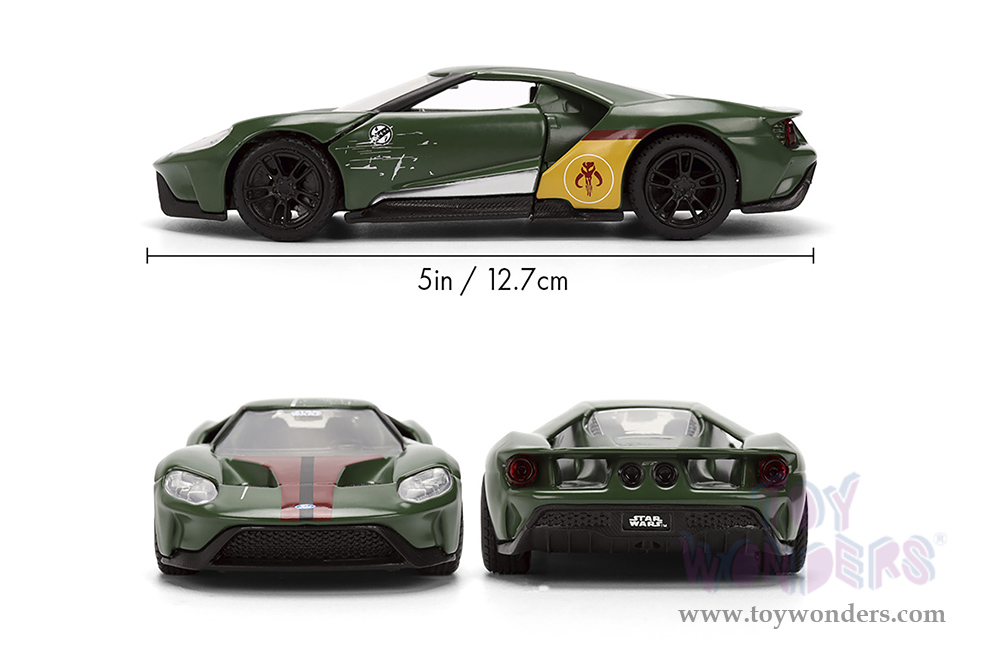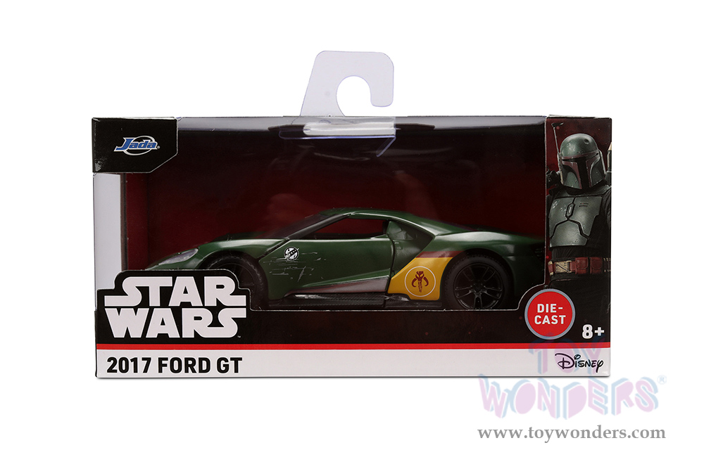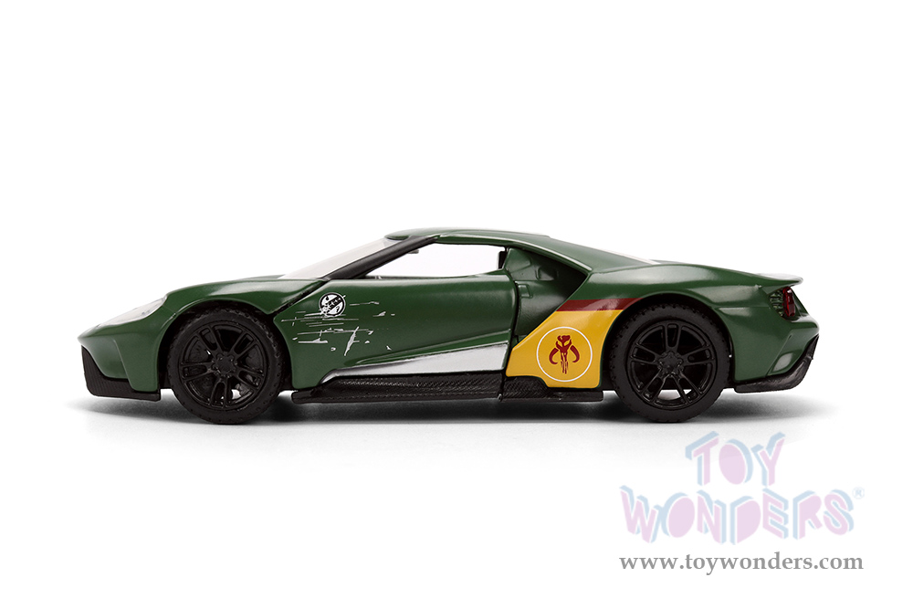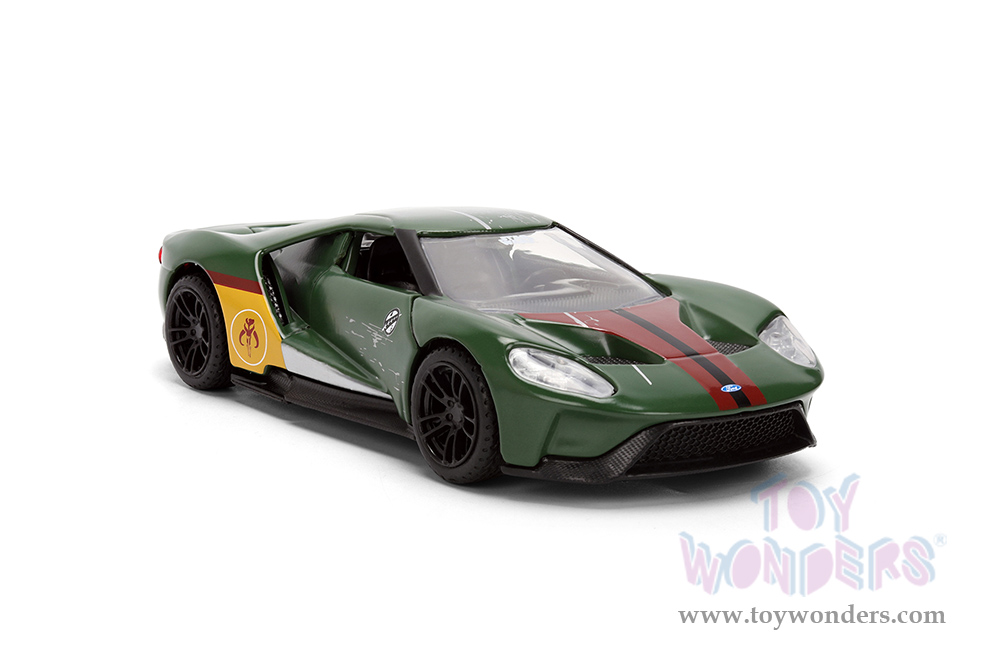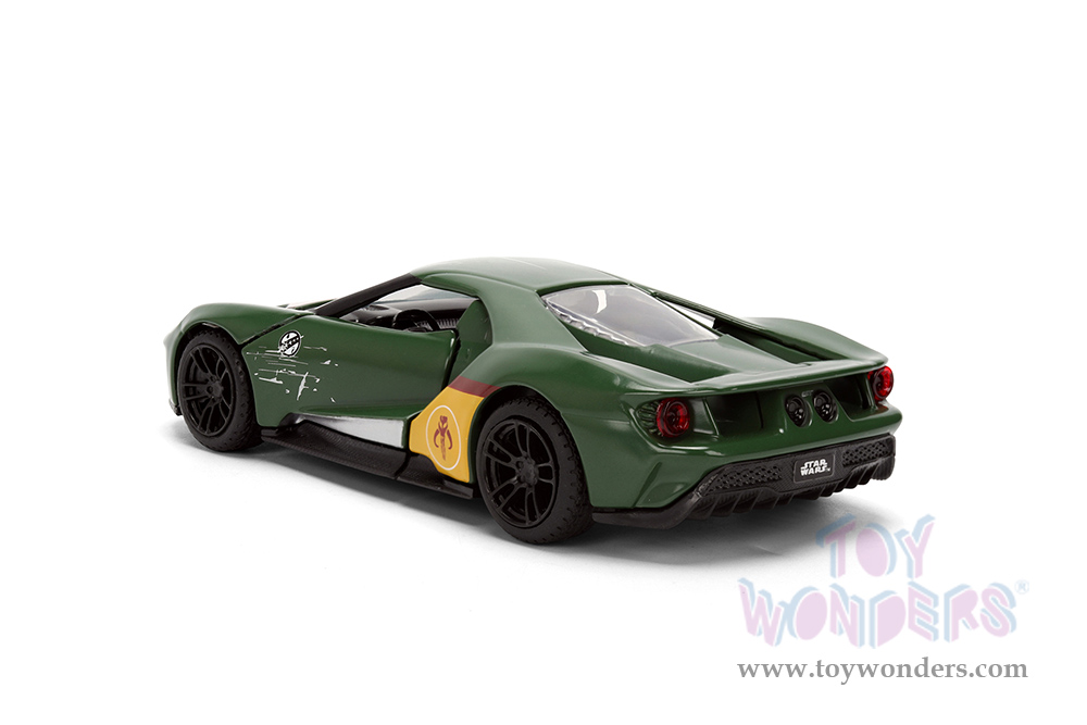 36916 Jada Toys - Hollywood Rides | 2017 Ford GT Boba Fett "Star Wars". 1:32 scale diecast collectible model car. This Ford GT is a 5"L x 2"W x 2"H diecast classic car. Openable doors. This Star Wars car is manufactured by Jada Toys. It comes individually packed in a hang tab window box. Window box is 6"L x 3"W x 3"H. Item 36916 is in dark green with Boba Fett graphics.