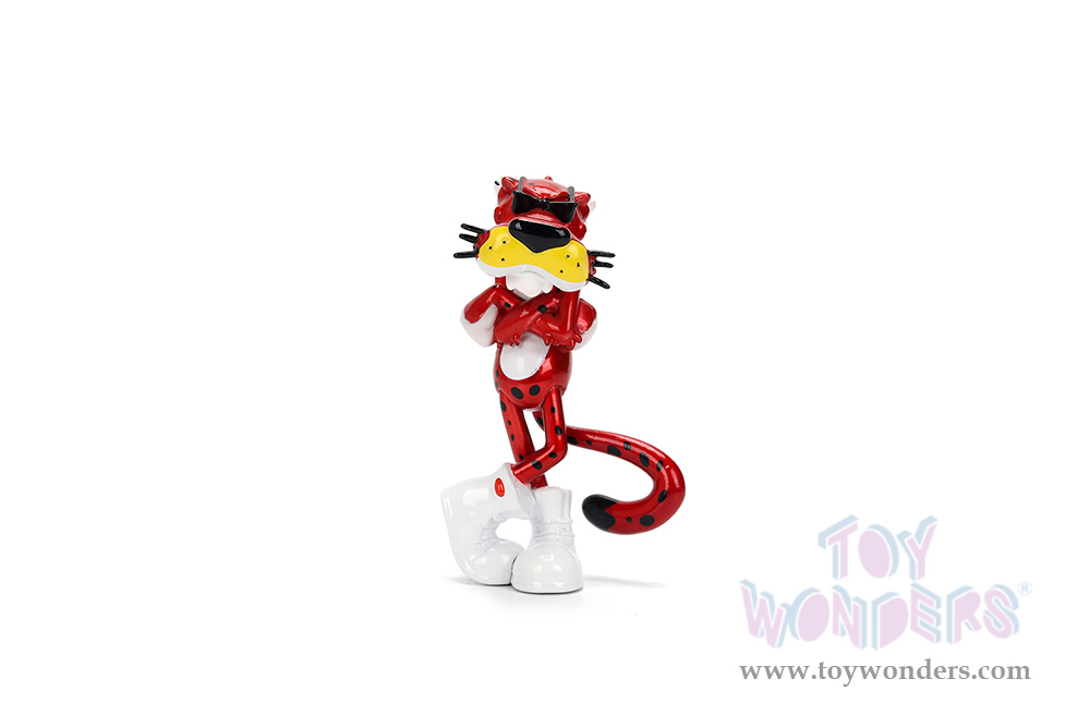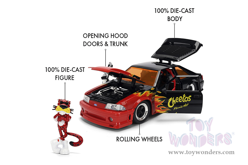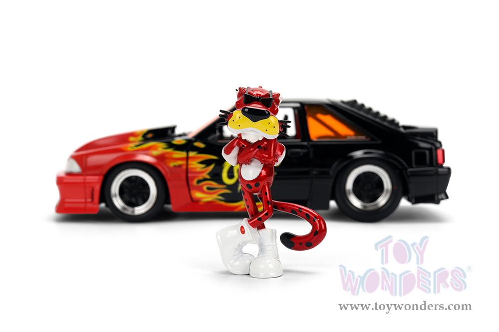 36255 Jada Toys - Hollywood Rides | 1989 Ford Mustang GT with Chester Cheetah Diecast Figure "Cheetos® Flamin' Hot®". 1:24 scale diecast collectible model car. This Ford Mustang is an 8" L x 3.75"W x 2.75"H diecast metal car with opening trunk, hood and doors. Freewheeling, Collectible Diecast Chester Cheetah figure is 3" tall. This 1989 Mustang GT is manufactured by Jada Toys. Individually packed in a window box (WB). Window box is 12"L x 6"W x 4.5"H. Item 36255 is in black with red and yellow flames.