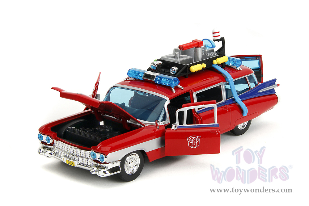 35466 Jada Toys - Hollywood Rides | Ghostbusters™ Ecto-1™ 1959 Cadillac Ambulance TRANSFORMERS®. 1:24 Scale diecast collectible metal car. This Ambulance is 9"L x 3.25"W x 3.75"H diecast metal car with openable doors, hood and rear door. Free wheeling. This Ghostbusters Ecto-1 is manufactured by Jada Toys. Individually packed in a window box. Window box is 12"L x 6"W x 4.5"H. Item 35466 is in red color.