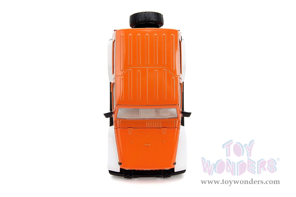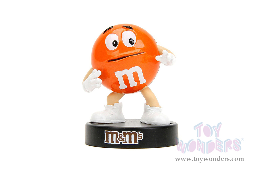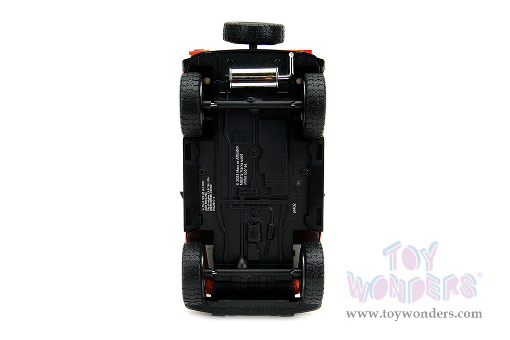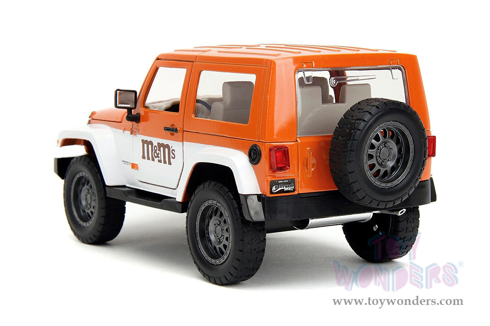 34401 Jada Toys - Hollywood Rides | 2017 Jeep® Wrangler with Orange M&M's Diecast Figure. 1:24 scale die-cast collectible model car. This Jeep® is a 7.25"L x 4"W x 2.25"H die cast metal car with opening hood and doors. Freewheeling. Orange M&M figurine is approximately 2.25 inches tall. This Jeep® Wrangler is manufactured by Jada Toys. Individually packed in a window box (WB). Window box is 12"L x 6"W x 4.5"H. Item 34401 is in orange and white.