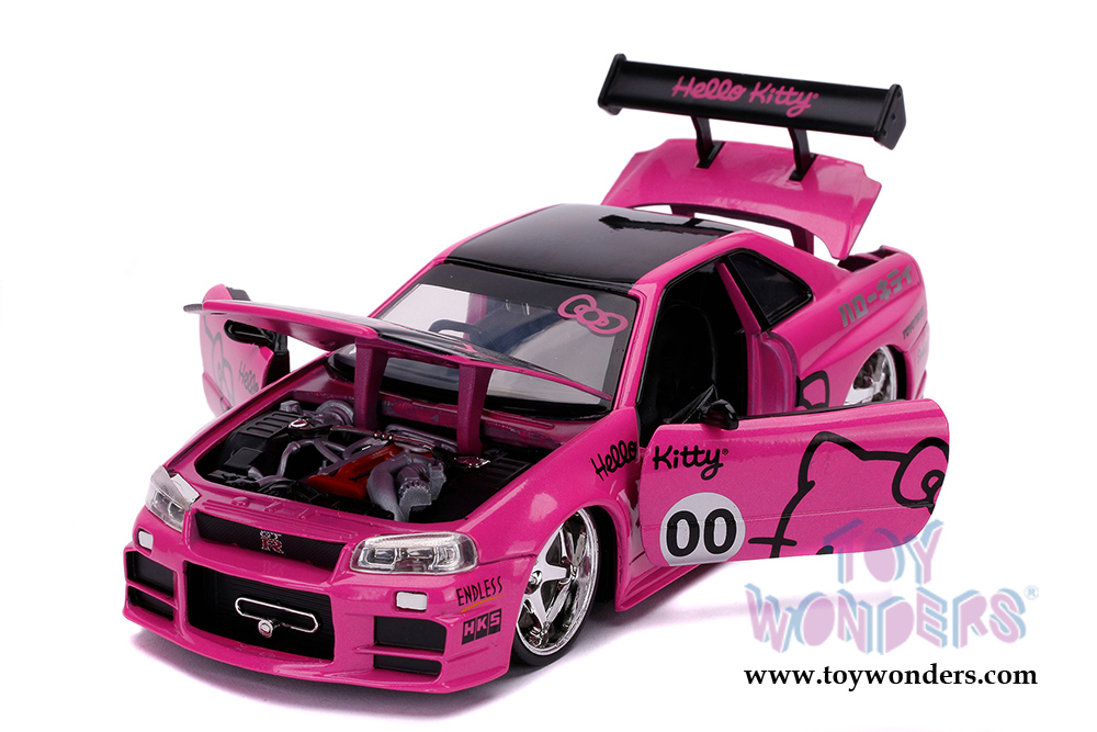 31613 Jada Toys - Hollywood Rides | 2002 Nissan Skyline GT-R (BNR34) with Hello Kitty™ figure. 1:24 scale die-cast collectible model car. This Nissan is an 8.5"L x 3.75"W x 2.5"H die cast metal car with opening hood, trunk and doors. Freewheeling. Hello Kitty™ figurine is approximately 2.5 inches tall. This Nissan is manufactured by Jada Toys. Individually packed in a window box (WB). Window box is 10"L x 6"W x 4.75"H. Item 31613 is in Pink with black.