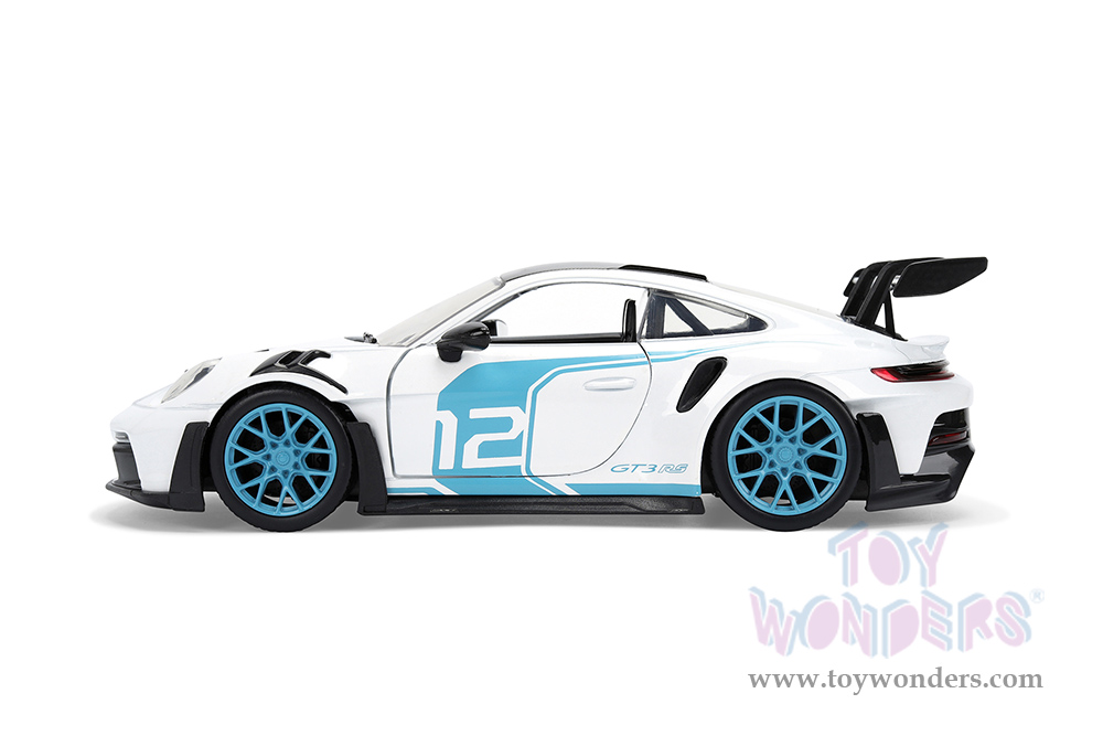 36494 Jada Toys Hyper-Spec - Porsche 911 GT3 RS (992) #12. 1:24 scale diecast collectible model car. This Porsche is a 7.5"Lx 3.375"Wx 2.25"H diecast metal car with freewheeling, openable doors and engine compartment. Detailed interior and exterior. This car is manufactured by Jada Toys. It comes individually packed in a window box. Window box is 10"L x 4.75"W x 4.75"H. Item 36494 is in white with black top and blue accents.