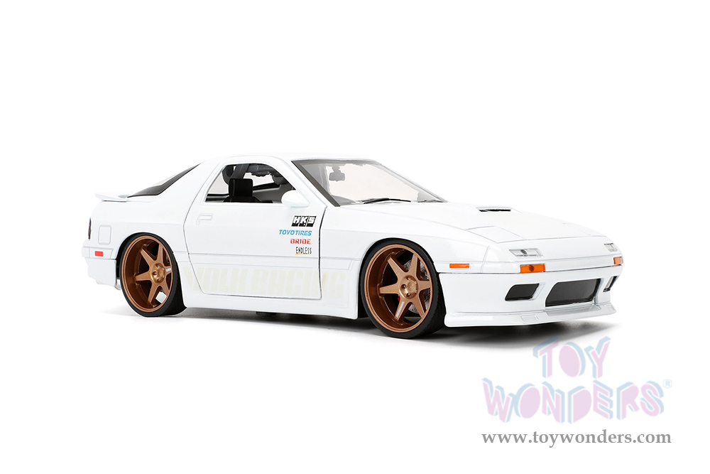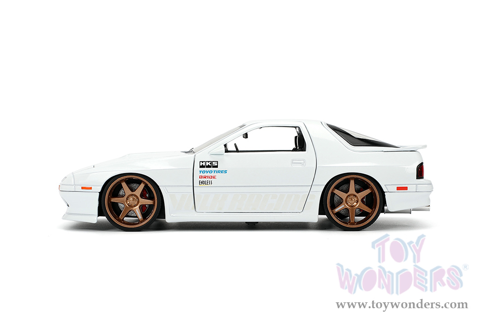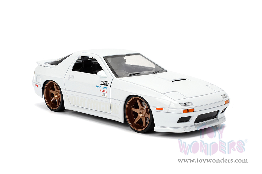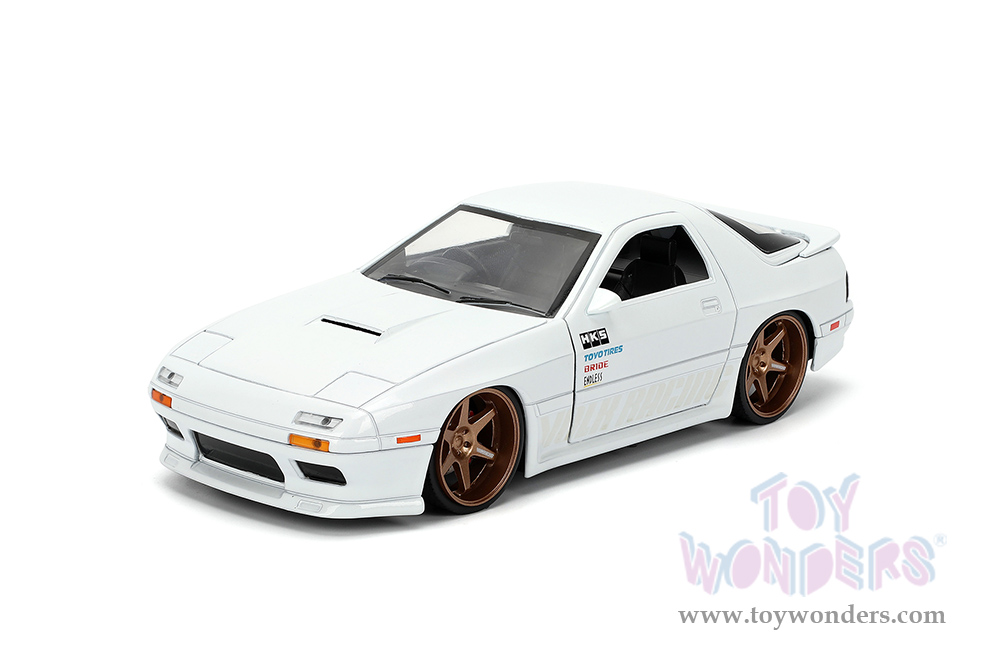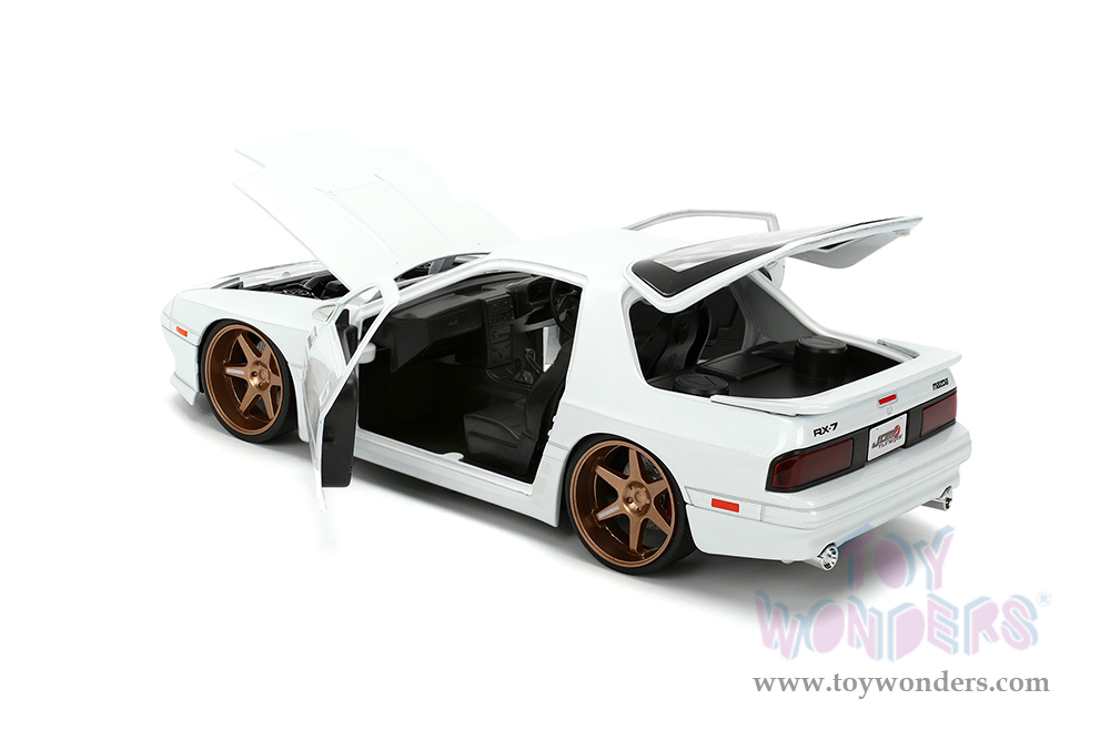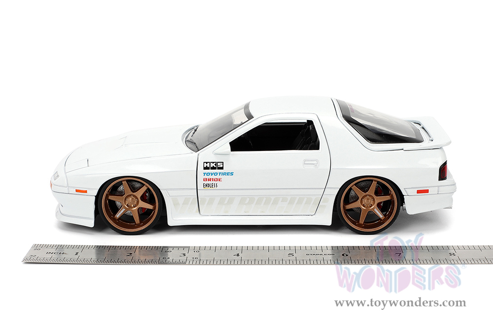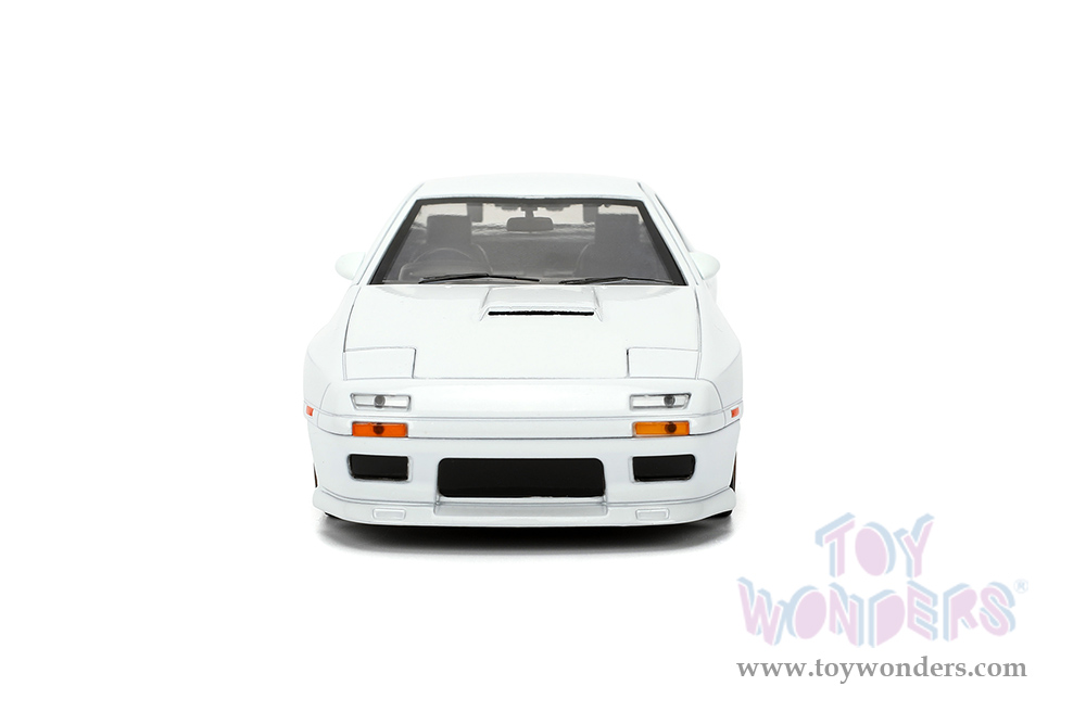 35955 Jada Toys JDM Tuners™- 1985 Mazda RX-7 FC. 1:24 scale diecast collectible model car. This Mazda is an 8"L x 3.75"W x 2.25"H diecast metal car with opening doors, hood, and trunk. Freewheeling. Detailed interior and exterior. This car is manufactured by Jada Toys. It comes individually packed in a window box. Window Box is 10"L x 4.75"W x 4.75"H. Item 35955 is in white.