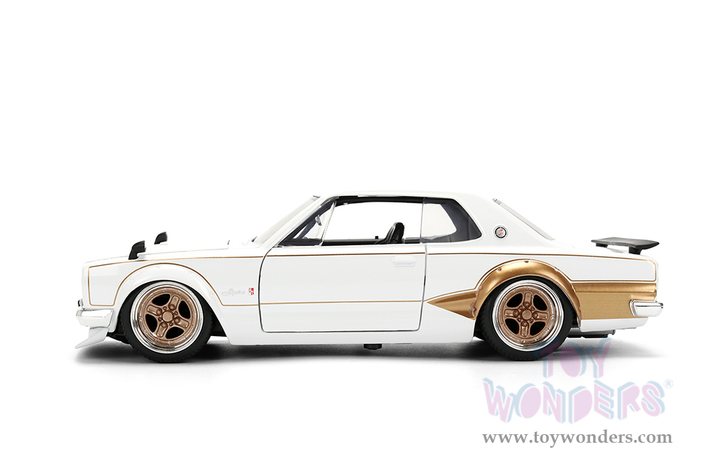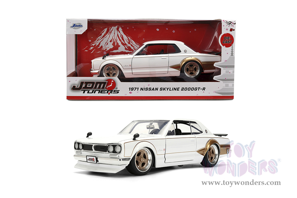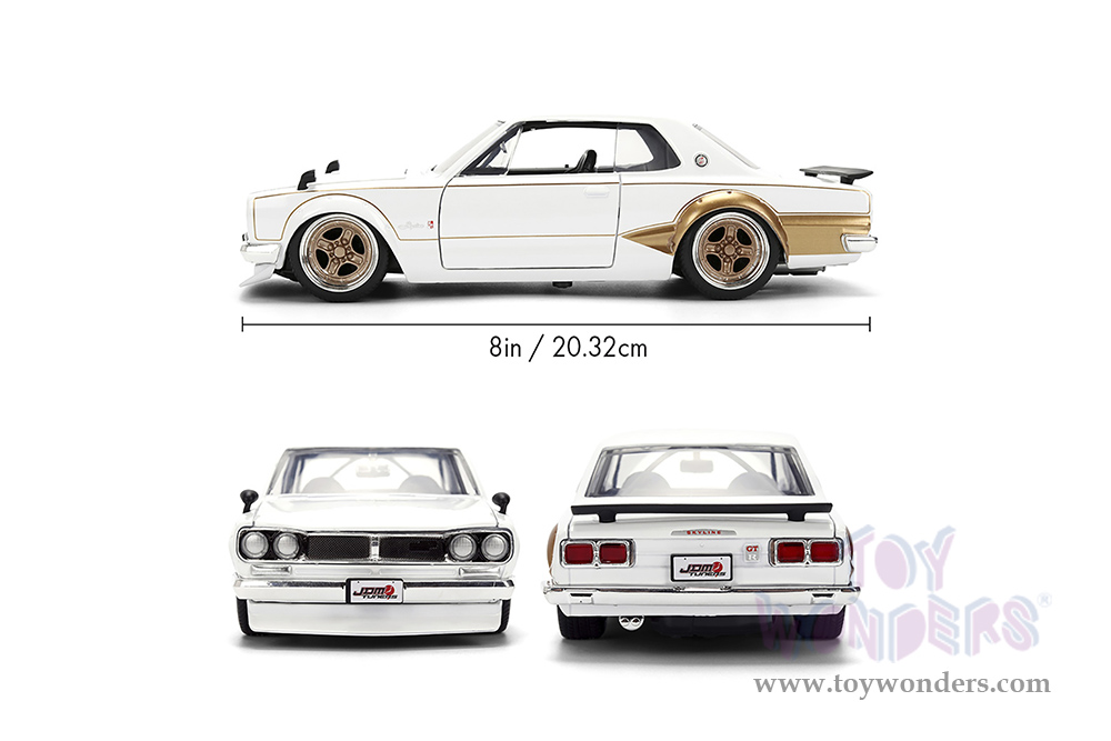 37021 Jada Toys JDM Tuners™ - 1971 Nissan Skyline GT-R Hardtop. 1:24 scale diecast collectible model car. This Nissan is an 8"L x 3"W x 2.25"H diecast metal cars with freewheeling, openable doors, trunk, and hood. This car is manufactured by Jada Toys. It comes individually packed in a window box. Window box is 10"L x 4.75"W x 4.75"H. Item 37021 is in white with gold.
